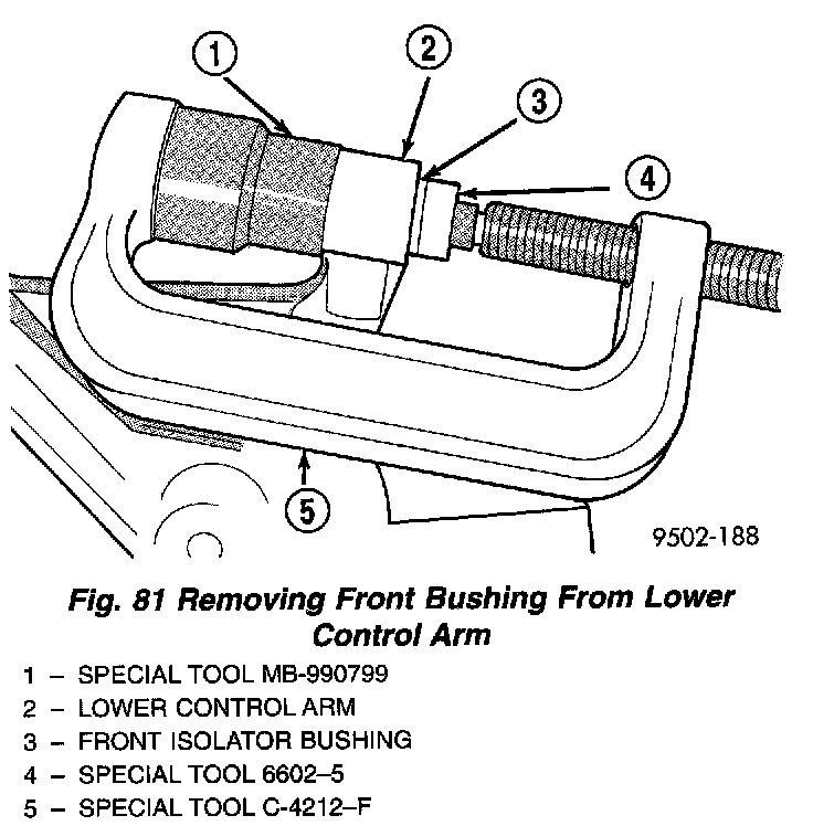 3. Install lower control arm on Special Tools assembled for removal of the front isolator bushing. Be sure Special Tool MB-990799 is square on lower control arm and Special Tool 6602-5 is positioned correctly on isolator bushing.