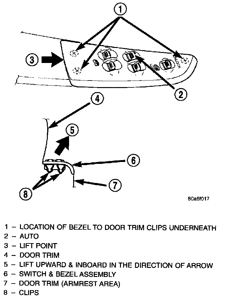 2. Start at the rear center of the bezel. Using your fingers or a trim stick, lift the bezel upwards and slightly inboard to disconnect the two rear clips. Use care not to mar the door trim.