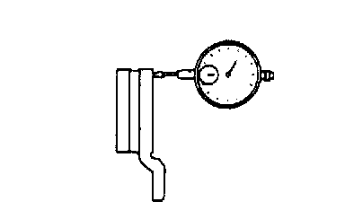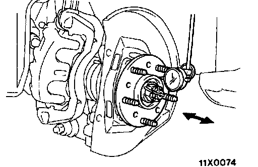 2. Remove the brake disc, and then place a dial gauge as shown in the illustration; then move the hub in the axial direction and measure the play.
