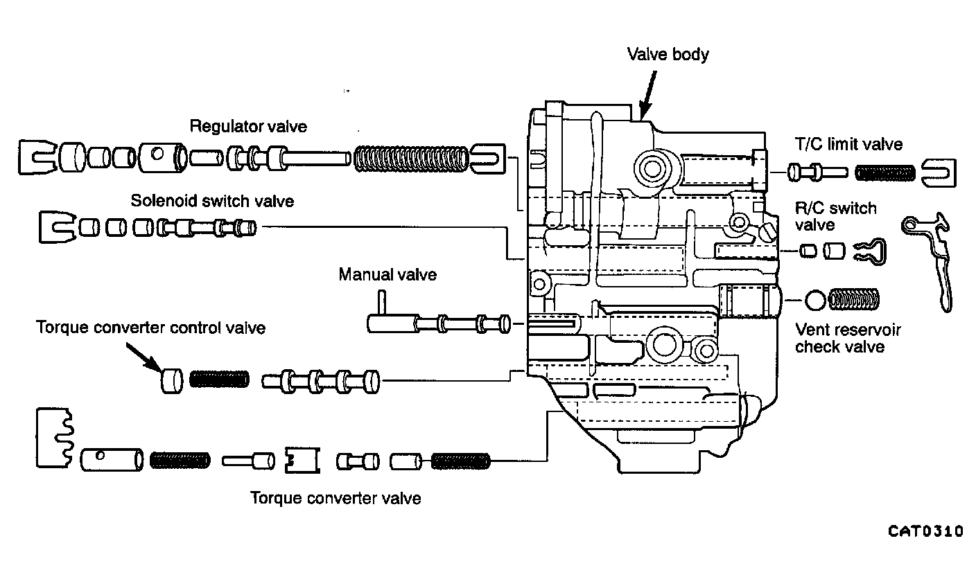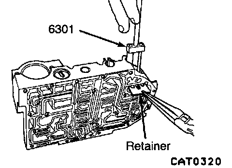 15. Remove dual retainer plate with Installer/Remover 6301. Remove torque converter control valve and torque converter clutch valve.