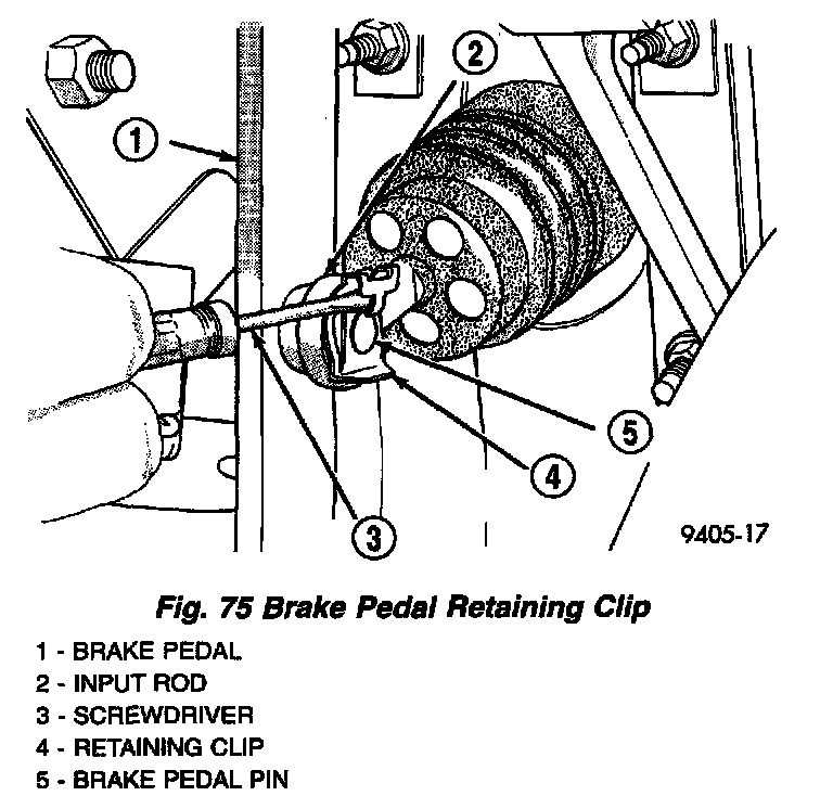 3. Remove the retaining clip from the brake pedal pin securing the power brake booster to the pedal using following procedure. Position a small screwdriver between the center tang on the retaining clip and the brake pedal pin. Rotate blade of screwdriver enough so center tang on retaining clip can pass over end of brake pedal pin, then pull retaining clip off brake pedal pin.