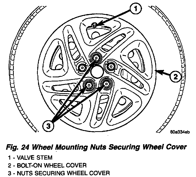 1. Noting the location of the valve stem in relationship to the wheel mounting nuts, remove the three wheel mounting nuts securing the wheel cover to the wheel and hub.