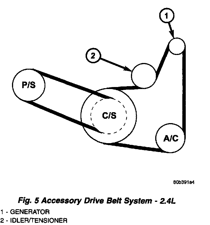 1. Install belt over all pulleys except for the air conditioning compressor pulley (Fig. 5).