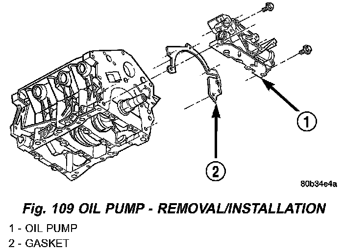 8. Remove the oil pump fasteners. Remove pump and gasket from engine (Fig. 109).