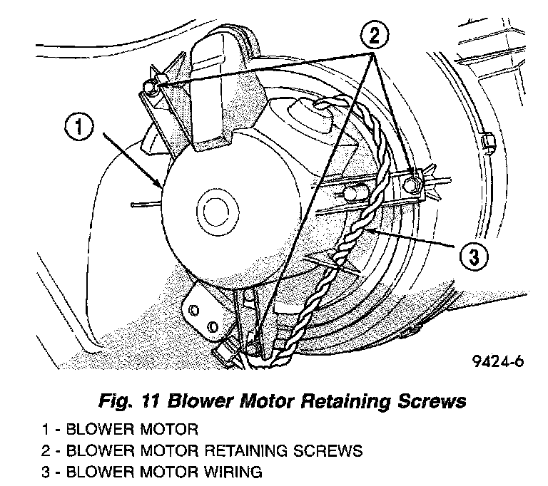 The blower motor is located on the bottom right side of the heater-A/C housing. The blower motor can be removed from the vehicle without having to remove the heater-A/C housing assembly.