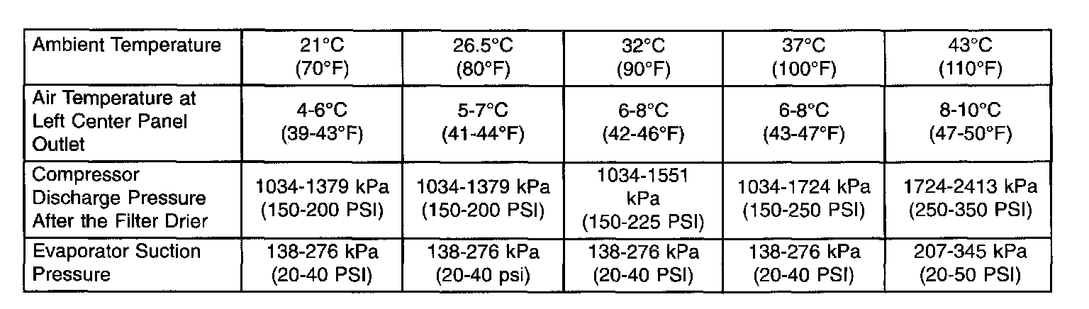 6. With the A/C clutch engaged, compare the discharge air temperature to the A/C Performance Temperatures chart. Refer to A/C Performance Temperatures Chart in this section.