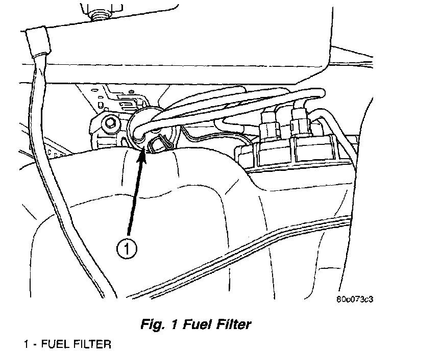 The fuel filter mounts to the front of the fuel tank (Fig. 1). The inlet and outlet ends of the filter are marked for correct installation.