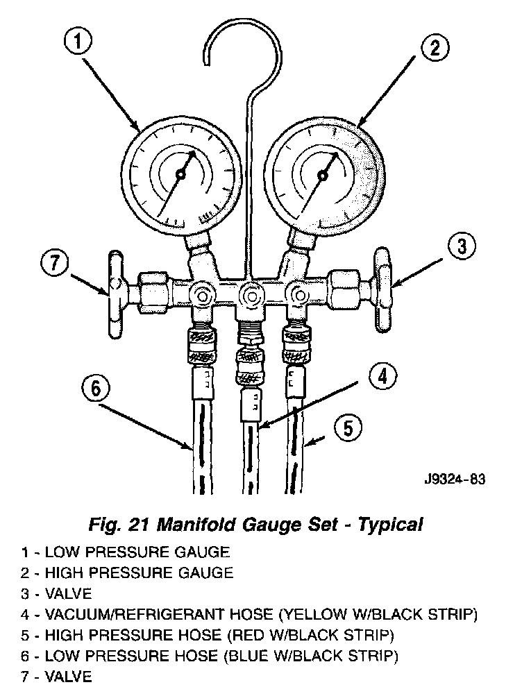 A manifold gauge set must also be used in conjunction with the charging and/or recovery/recycling device. Only use gauges that have not been used for R-12. The service hoses on the gauge set should have manual (turn wheel) or automatic back flow valves at the service port connector ends. This will prevent refrigerant R-134a from being released into the atmosphere.