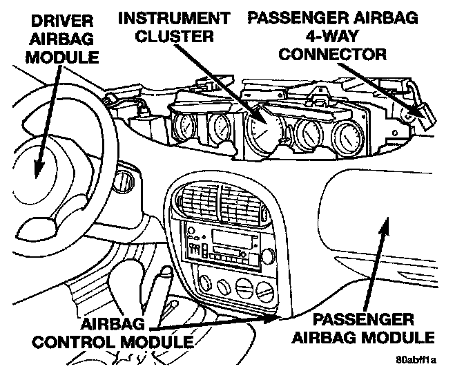 The Airbag Control Module is mounted on the tunnel/floor pan in front of the gear shift lever and below the center of the instrument panel.