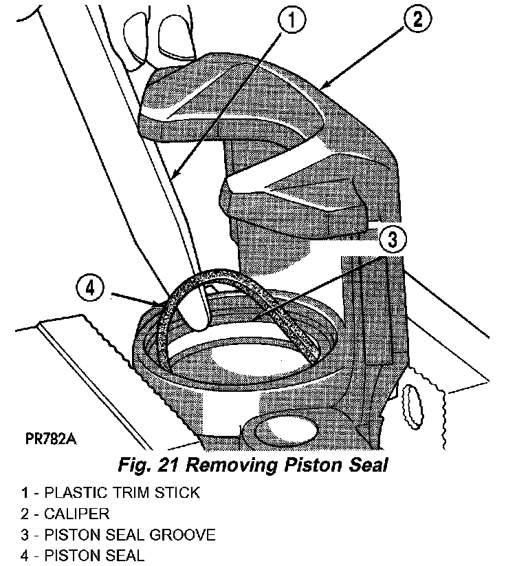 6. Using a soft tool such as a plastic trim stick, work the piston seal out of its groove in caliper piston bore. Discard the old seal.