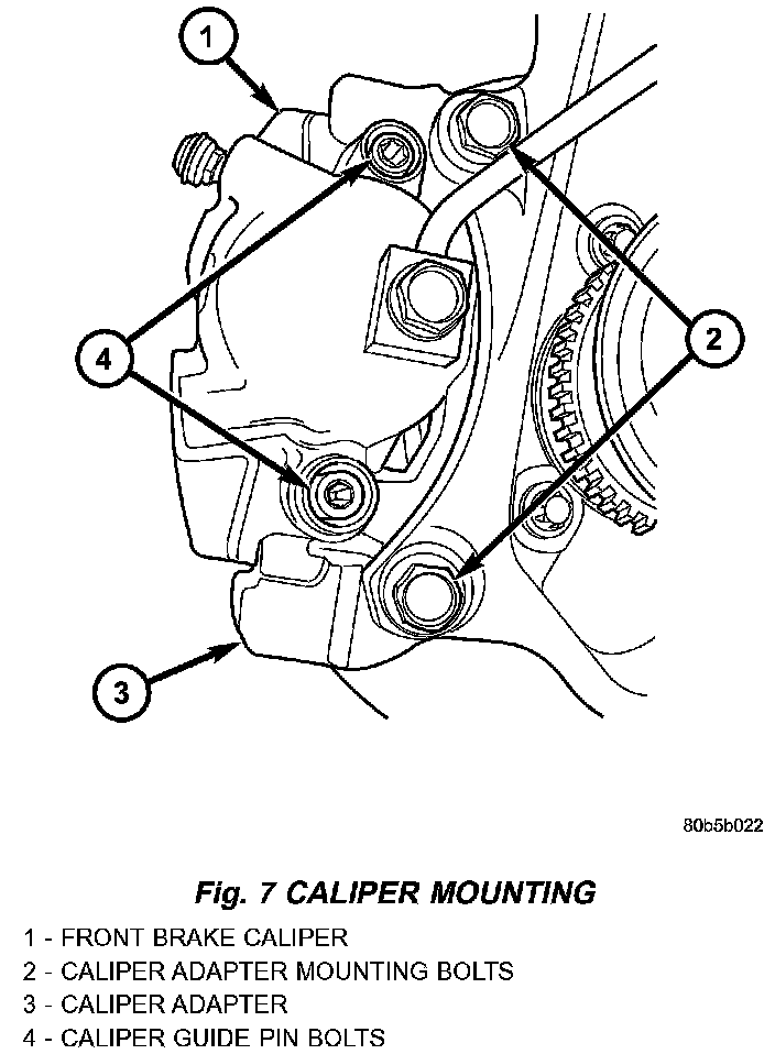 7. Carefully position the brake caliper over the brake rotor and adapter.