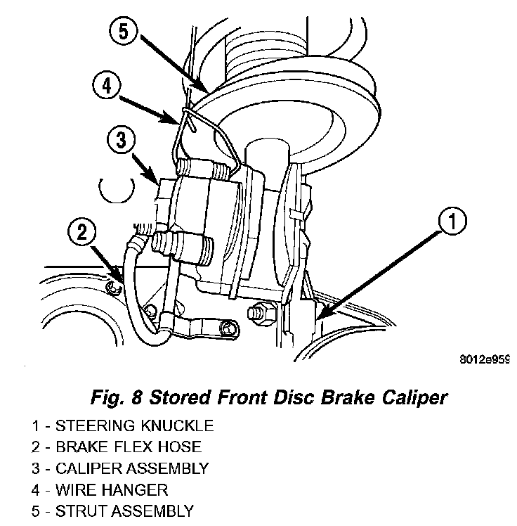 7. Using wire or cord, hang the caliper from the front strut assembly. Support the caliper firmly to prevent weight of caliper from being supported by the brake fluid hose.