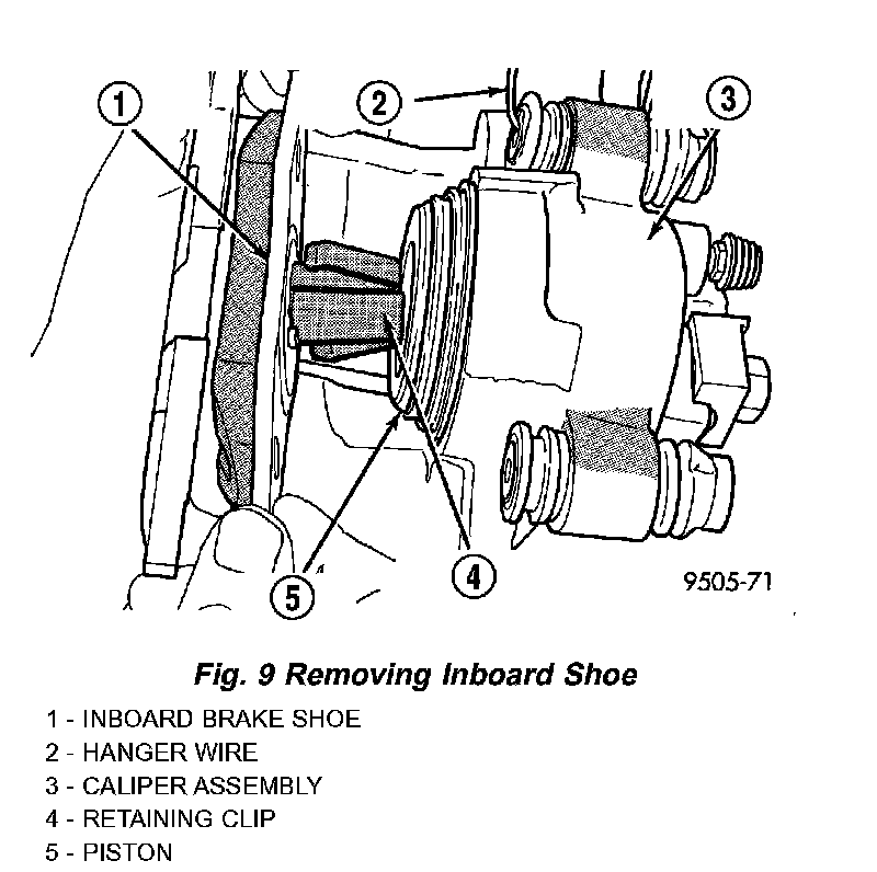 9. Pull the inboard brake shoe away from the caliper piston until the retaining clip on shoe is free from the cavity in the caliper piston.