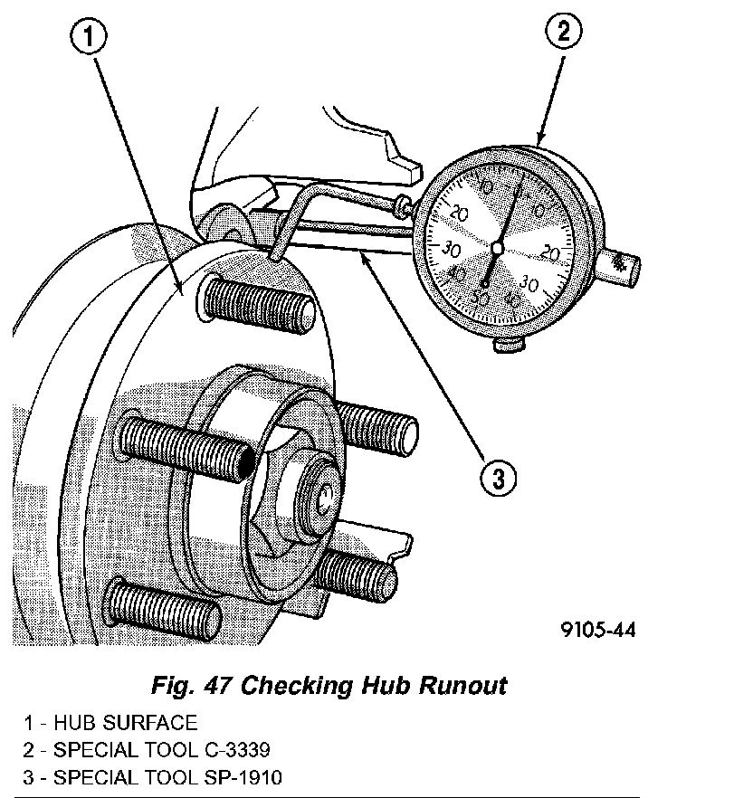 Mount Dial Indicator, Special Tool C-3339, and Mounting Adapter, Special Tool SP-1910, to the steering knuckle. Position the indicator stem so it contacts the hub face near the outer diameter. Care must be taken to position stem outside of the stud circle, but inside of the chamfer on the hub rim.