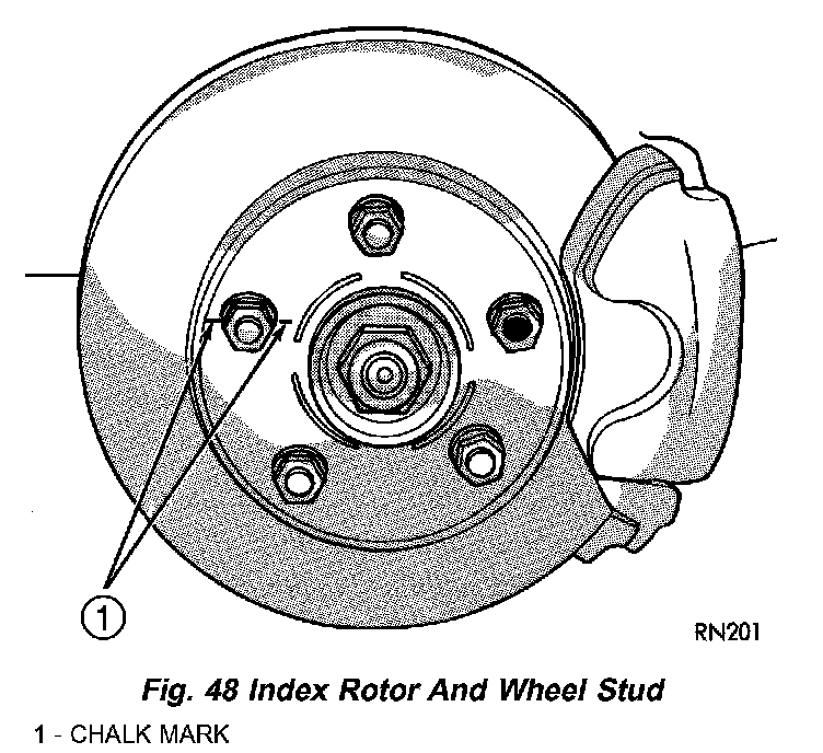 If the hub runout does not exceed this specification, install the rotor back on the hub, aligning the chalk marks on the rotor with a wheel mounting stud, two studs apart from the original stud. Tighten nuts in the proper sequence and torque to specifications. Recheck brake rotor runout to see if the runout is now within specifications.