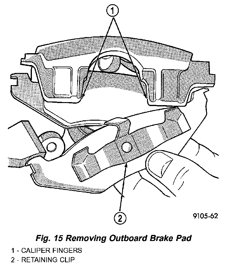 7. Remove outboard brake pad from caliper by prying brake pad retaining clip over raised area on caliper. Then slide brake pad down and off the caliper.