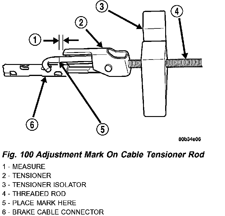 ADJUSTMENT - PARKING BRAKENOTE: Tension adjustment is only necessary when the tensioner, or a cable has been replaced or disconnected for service. When adjustment is necessary, perform adjustment only as described in the following procedure. This is necessary to avoid faulty park brake operation.