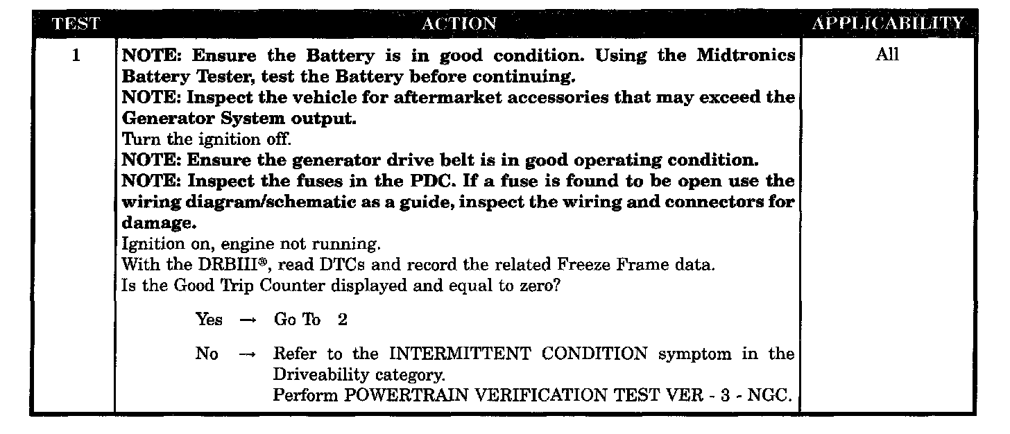 The battery sensed voltage is 1 volt below the charging goal for 13.47 seconds. The PCM senses the battery voltage turns off the field driver and senses the battery voltage again. If the voltages are the same, the code is set. One trip Fault.