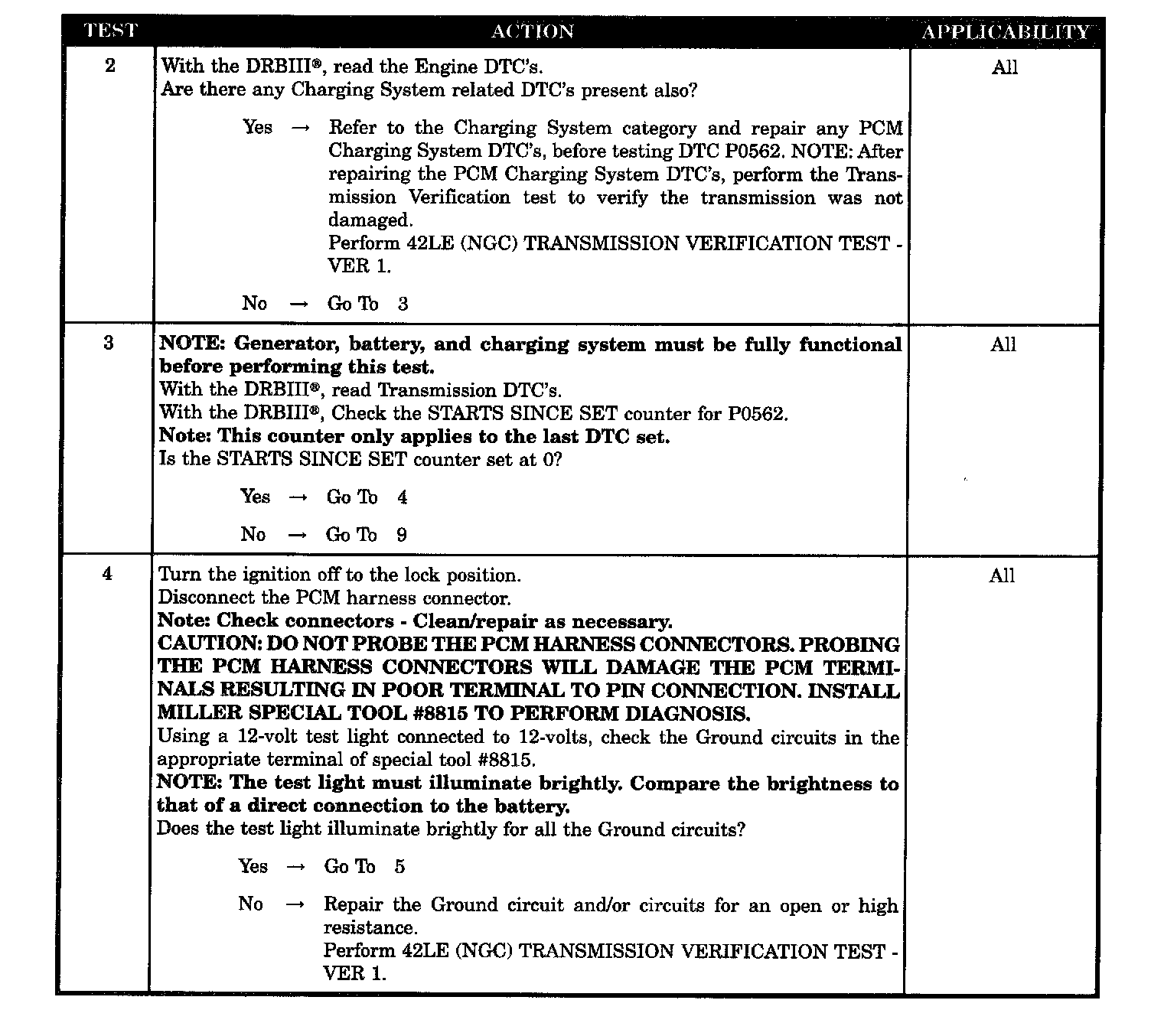 NOTE: P0562 generally indicates a gradually falling battery voltage or a resistive connection(s) to the PCM. The DTC will also set if the battery voltage sensed at the PCM is less than 6.5v for 200ms or where Transmission Control Relay Output circuits is less than 7.2v for 200ms.
