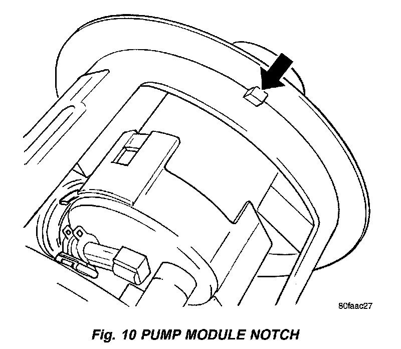 2. Position fuel pump in the tank. Make sure the alignment tabs on the underside of the fuel pump module flange (Fig. 10) sits in the notches on the fuel tank (Fig. 11).
