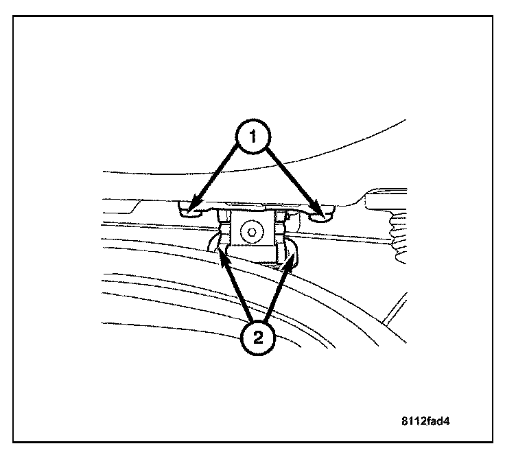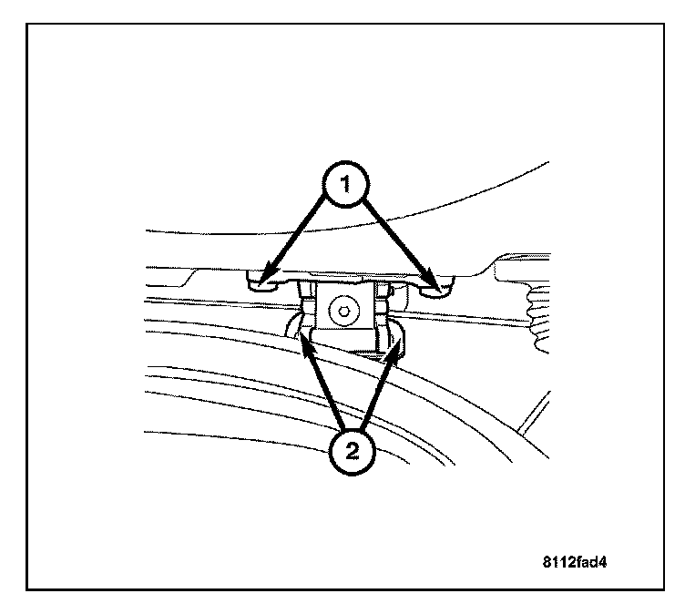7. Have a helper hold the liftgate and remove the two bolts (2) from each hinge under the roof of the vehicle, leaving the hinge bolts (1) attached to the liftgate.