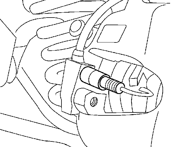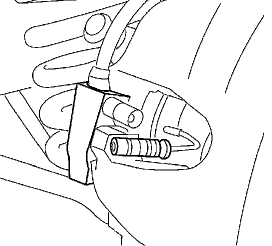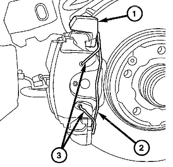 7. Install the caliper support spring (2) in the top end of the caliper and under the mounting bracket (1). Then install the other end into the lower caliper hole (3). Hold the spring (2) into the caliper hole (3) with your thumb while prying the end of the spring (2) out and down under the mounting bracket with a screwdriver.