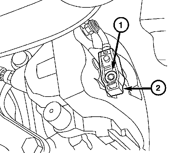 5. Install the brake pad wear indicator (2) onto the caliper. Tighten the bolt to 8 Nm (6 ft. lbs.).