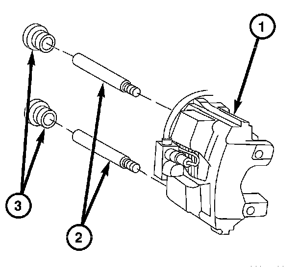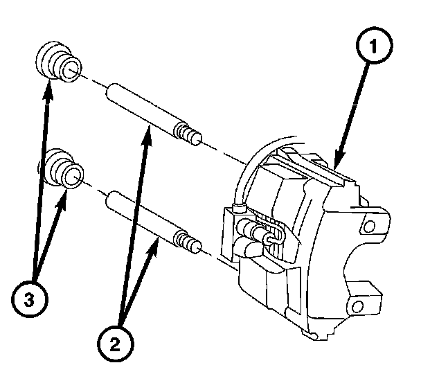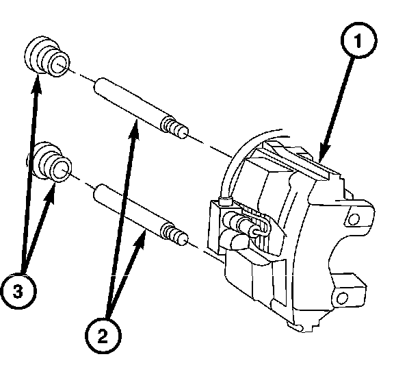 8. Remove the caliper slide pin caps (3) and slide pins (2) from the caliper (1).