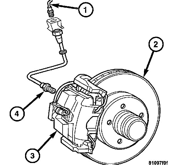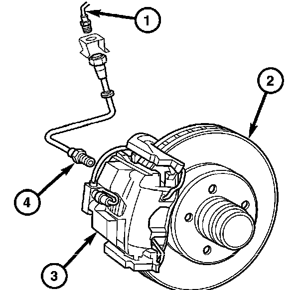 1. Install the inboard and outboard brake pads (2 and 3) onto the caliper (1).