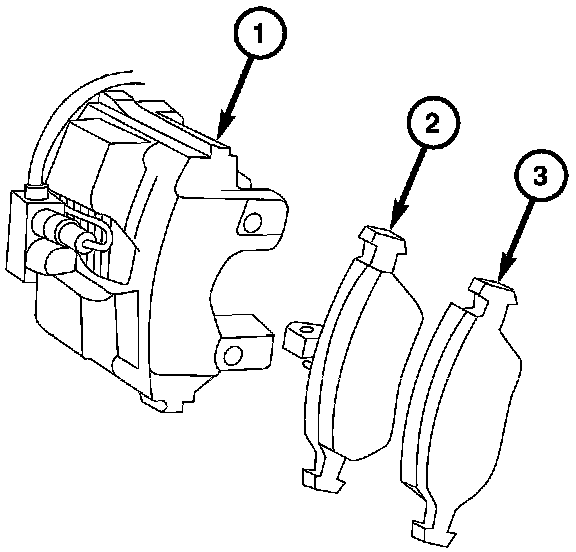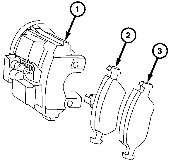 11. Remove the inboard and outboard brake pads (2 and 3) from the caliper (1).