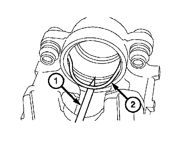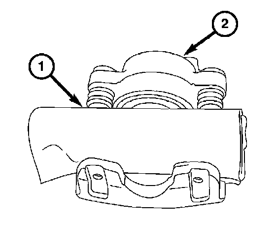 7. Remove the caliper support spring (2) by prying the spring out of the caliper (1).