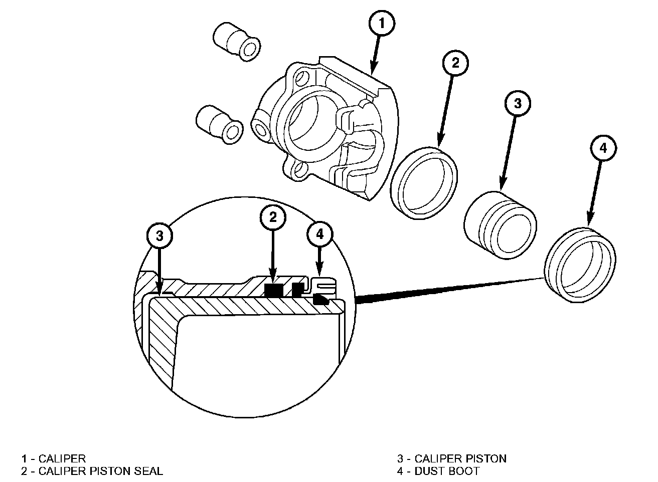CAUTION: If the caliper piston is replaced, install the same type piston in the caliper. Never interchange phenolic resin and steel caliper pistons. The pistons, seals, seal grooves, caliper bore and piston tolerances are different.