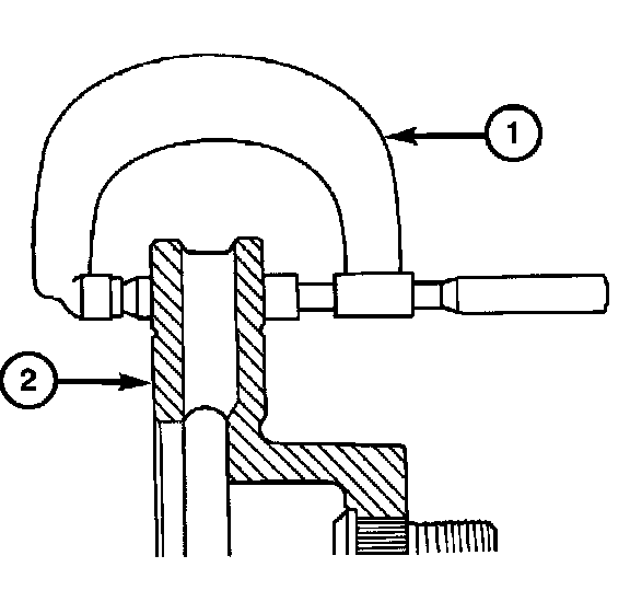 Measure rotor (2) thickness a minimum of six points around the rotor face with a micrometer (1). Position the micrometer approximately 3/4 inch (19 mm) from the rotor outer circumference for each measurement.