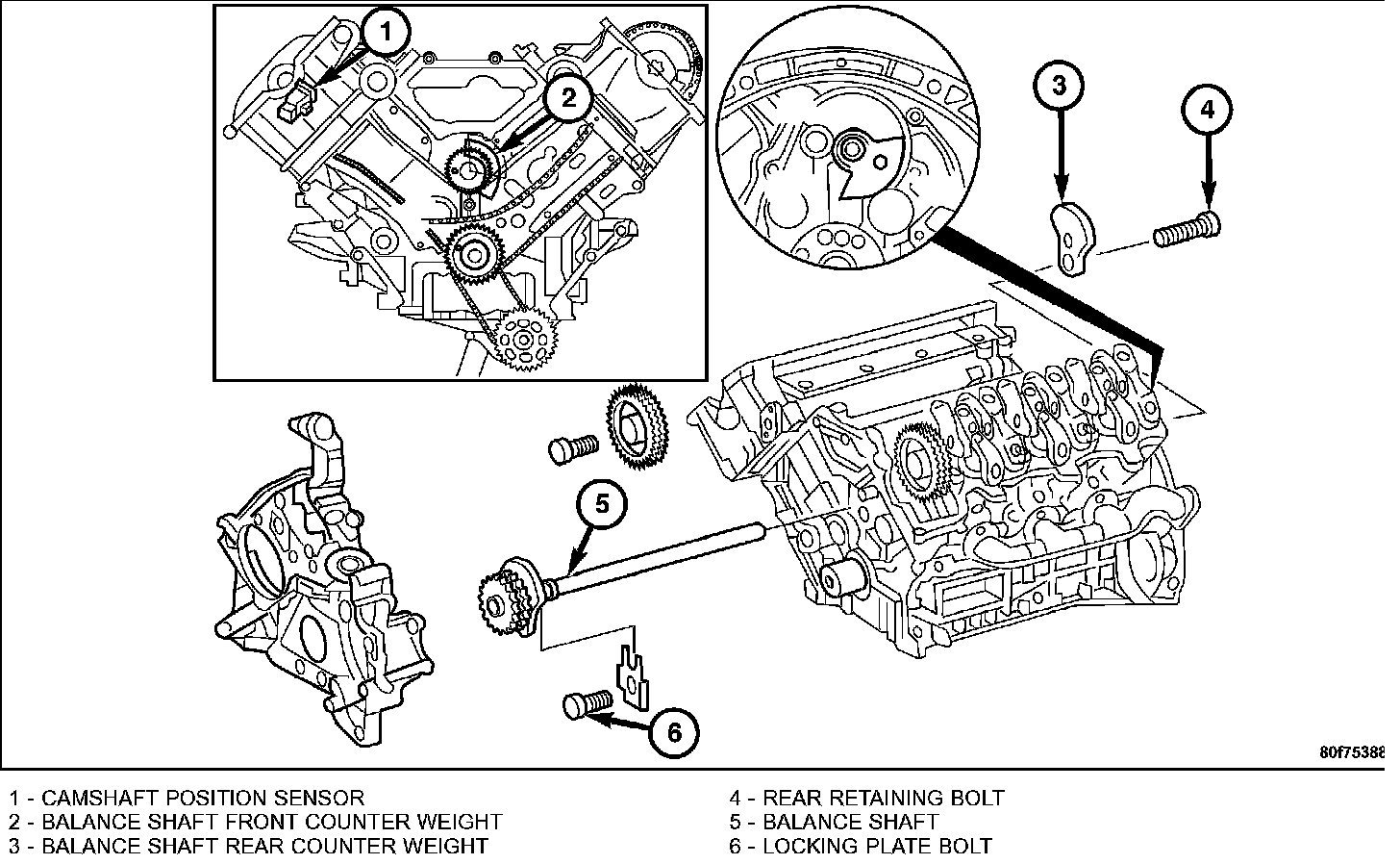 9. Remove the balance shaft locking plate bolt (6) and locking plate at the front of the engine block.