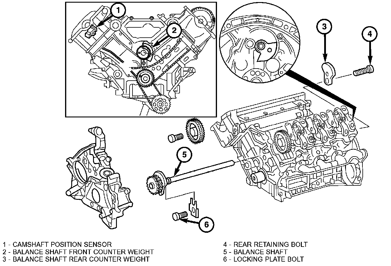 Note: Balance shaft rear retaining bolt (4) must be replaced if length exceeds 50 mm.