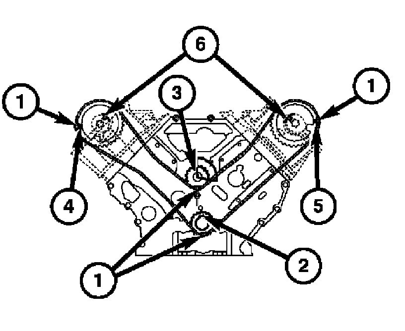 OPERATIONThe crankshaft driven timing chain maintains camshaft (6) and balance shaft (3) operation and timing. Timing marks on the crankshaft (2), balance shaft (3) and camshafts (5) are aligned with copper links (1) in the timing chain to keep symmetrical valve and ignition performance.