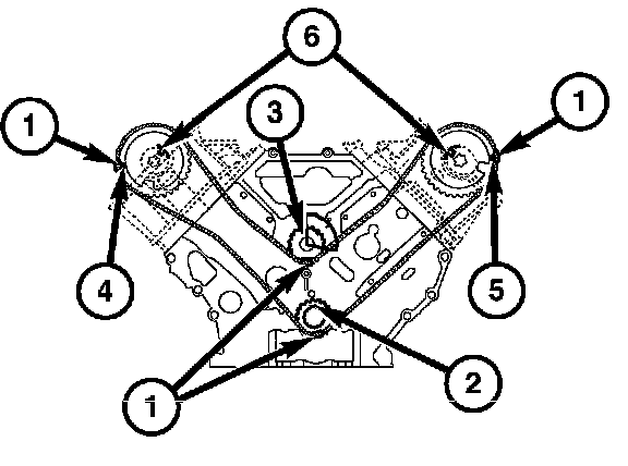 5. Insert the camshaft sprockets (6) into the timing chain and align the camshaft sprocket timing marks (4) and (5) with the copper teeth (1) of the timing chain.