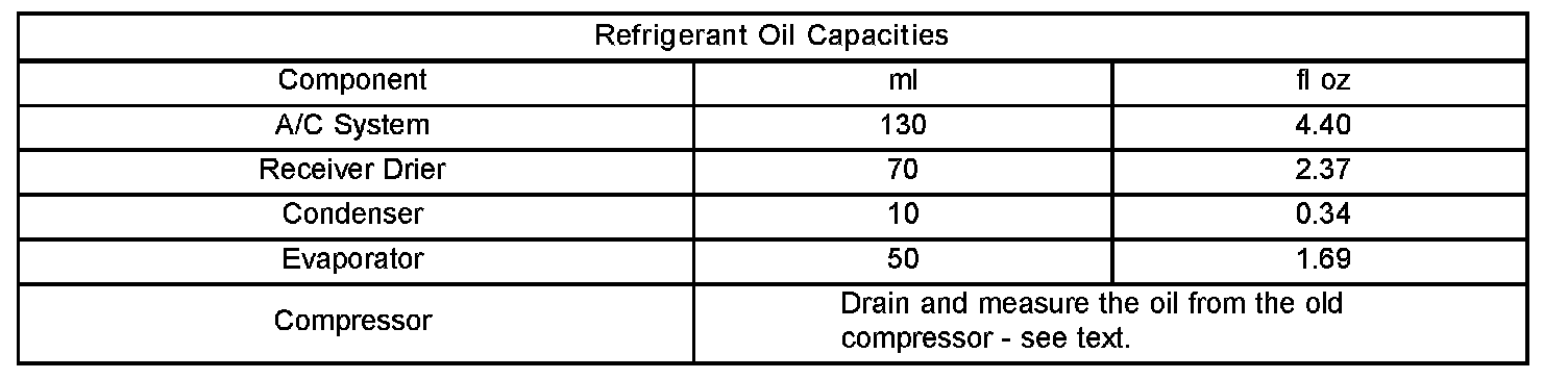 Refrigerant oil must be added when a accumulator, evaporator coil, or condenser are replaced. See the Refrigerant Oil Capacities chart. When a compressor is replaced, the refrigerant oil must be drained from the old compressor and measured. Drain all of the refrigerant oil from the new compressor, then fill the new compressor with the same amount of refrigerant oil that was drained out of the old compressor.