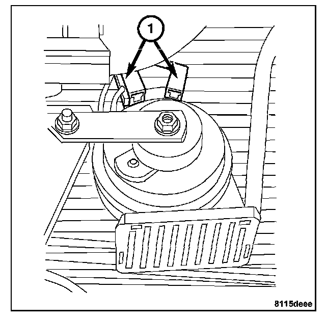 1. Position the horn(s) (1) onto the vehicle core support and install the horn bracket mounting bolt. Tighten the bolt to 11.3 Nm (100 in. lbs.).