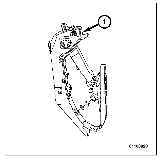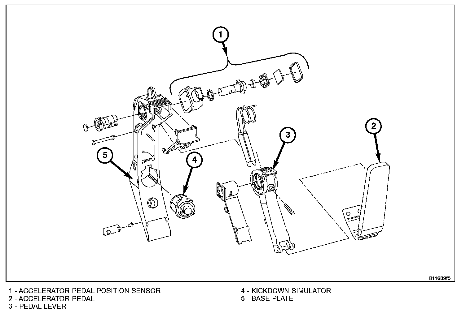 The accelerator pedal position sensor (1) is located inside the accelerator pedal. The accelerator pedal position sensor (1) can not be serviced by itself. The accelerator pedal must be replaced as a unit.