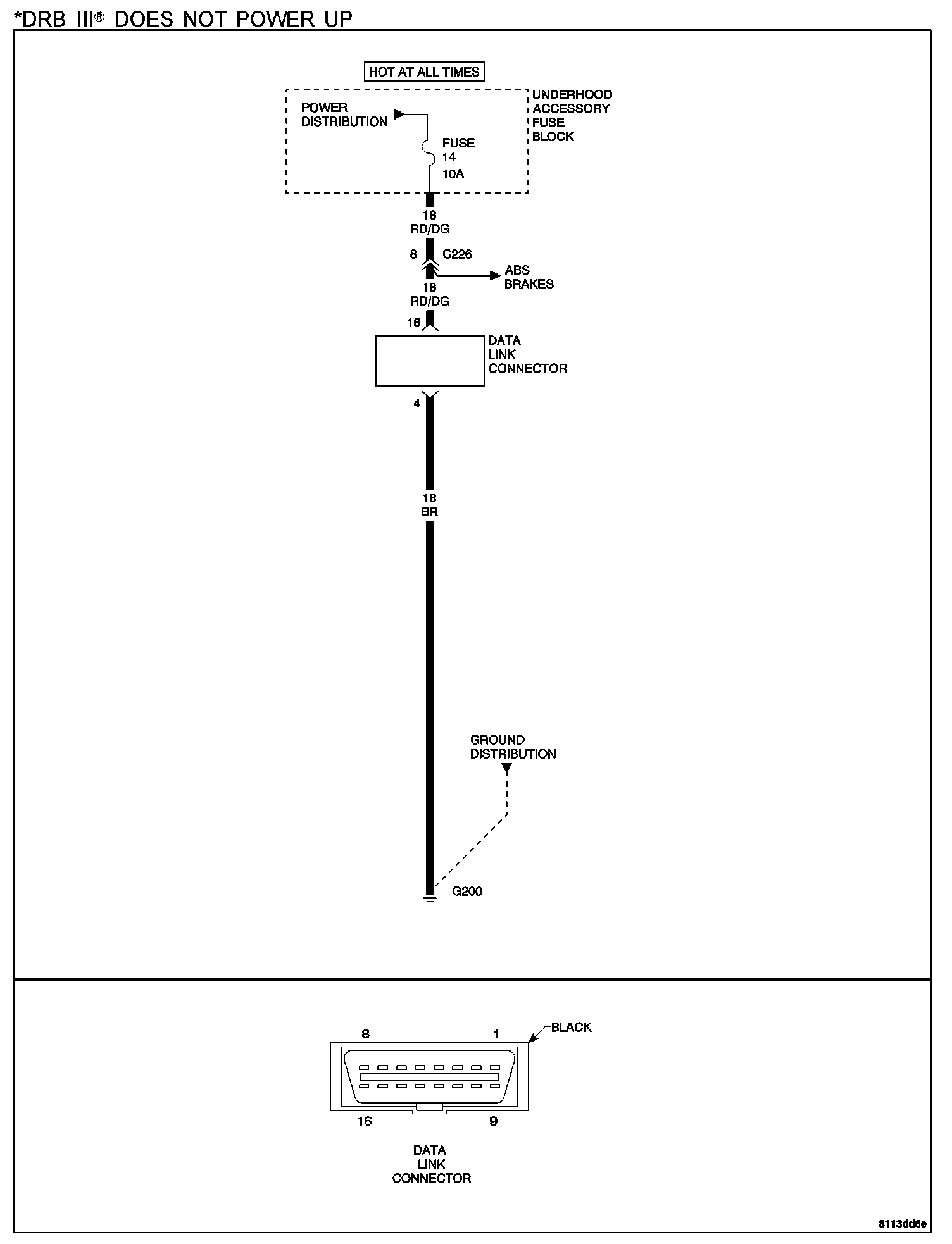 NOTE: If the LEDs do not light or no sound is emitted at start up, check for loose cable connections or a bad cable. Check the vehicle battery voltage (data link 16-way connector cavity 16). A minimum of 11 volts is required to adequately power the DRB III(R). Check for a proper ground at DLC cavity 4. If all connections are proper between the DRB III(R) and the vehicle or other devices and the vehicle battery is fully charged, an inoperative DRB III(R) may be the result of a faulty cable.