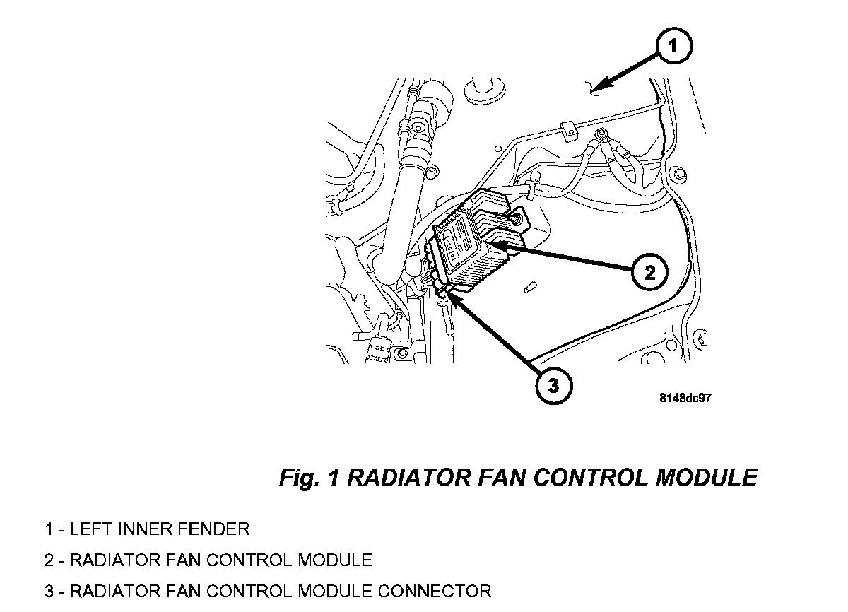 17. To reduce battery drain during the flash process, disconnect the radiator fan control module connector (Fig. 1).