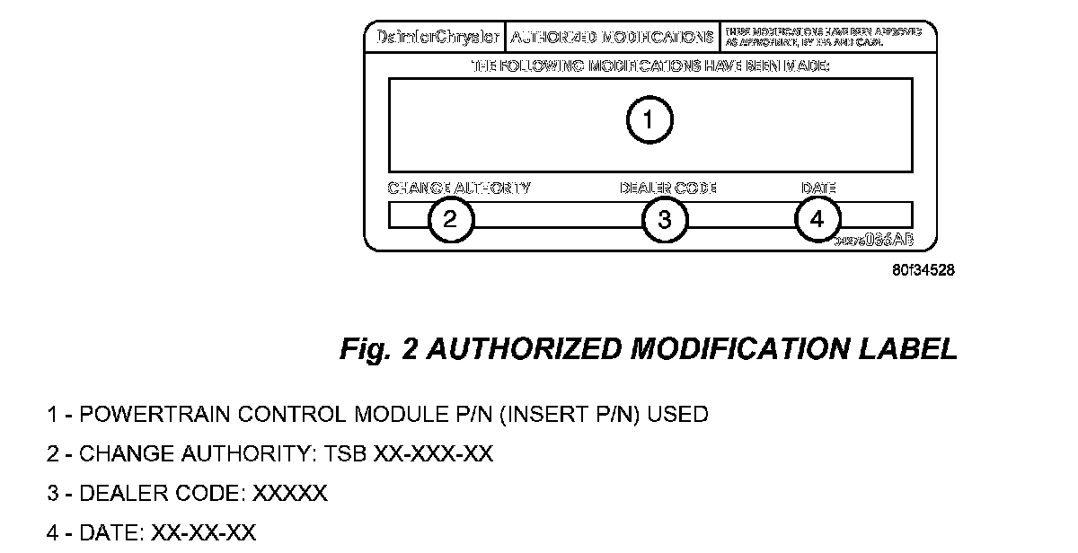 34. Type the necessary information on the "Authorized Modification Label" p/n 04275086AB and attach near the VECI label (Fig. 2).