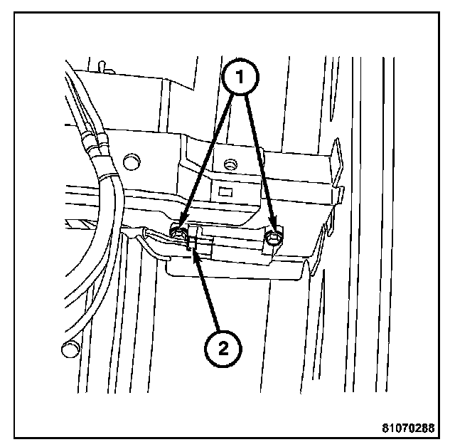 Two side impact sensors (2) are used, one each for the left and right sides of the vehicle. These sensors are mounted remotely from the bi-directional safing sensor that is internal to the Occupant Restraint Controller (ORC). The side impact sensors are secured with two bolts (1) to the floor below the carpet under the seats.
