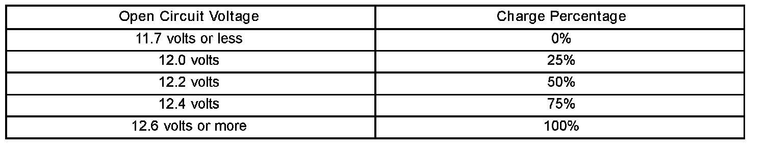 See the Open-Circuit Voltage Table. This voltage reading will indicate the battery state-of-charge, but will not reveal its cranking capacity. If a battery has an open-circuit voltage reading of 12.4 volts or greater, it may be load tested to reveal its cranking capacity.