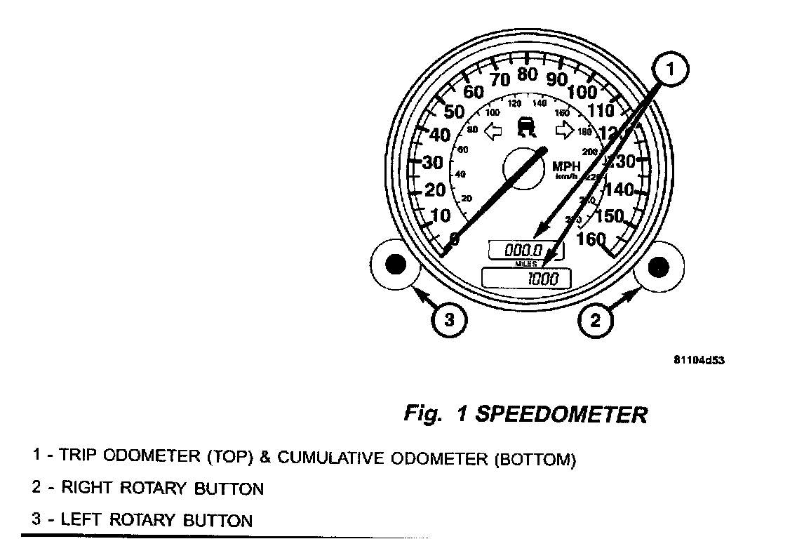 Located within the tachometer with the ignition in the ON/RUN or ACCESSORY (ACC) position, pull the right rotary button (Fig. 1) out; turn it to the left to adjust the hour; turn it to the right to adjust the minutes.