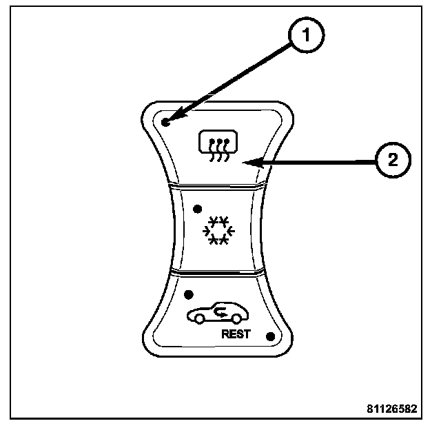 Electric rear window defogger is standard equipment. A push button rear window defogger switch (2) located in the center console turns the system ON and is illuminated with instrumentation lighting for easy night time use. An LED (1) in the push button switch illuminates when the rear window defogger is working. When energized, a grid on the inside of the liftgate window heats up to help clear the outside surface of ice, snow or fog.