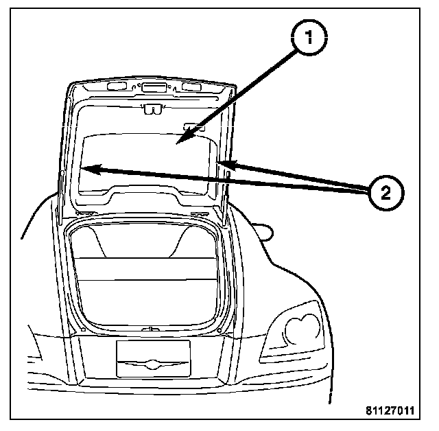 When the rear window defogger switch is pressed with the ignition switch turned to the ON/RUN position, electrical current from fuses 25 and 26 in the Underhood Accessory Fuse Block is applied to a series of horizontal silver-ceramic grid lines (1) through the two vertical bus bars (2) on the glass inside surface. When the circuit is operating, the grid lines provide heat in the form of resistance. The heat is transferred to the outside surface to clear fog or snow. The grid lines comprise a parallel electrical circuit and are bonded to the glass permanently. Both the horizontal grid lines (1) and the vertical bus bars (2) are highly resistant to abrasion. However, it is possible for an open circuit to occur in an individual grid line resulting in no current flow. Care should be taken when cleaning the glass or removing foreign materials, decals or stickers. Normal glass cleaning solvents or hot water is recommended for cleaning. The grid lines and bus bars are repairable if they become damaged. For complete heated grid line and bus bar repair instructions see rear window defogger grid standard procedure.
