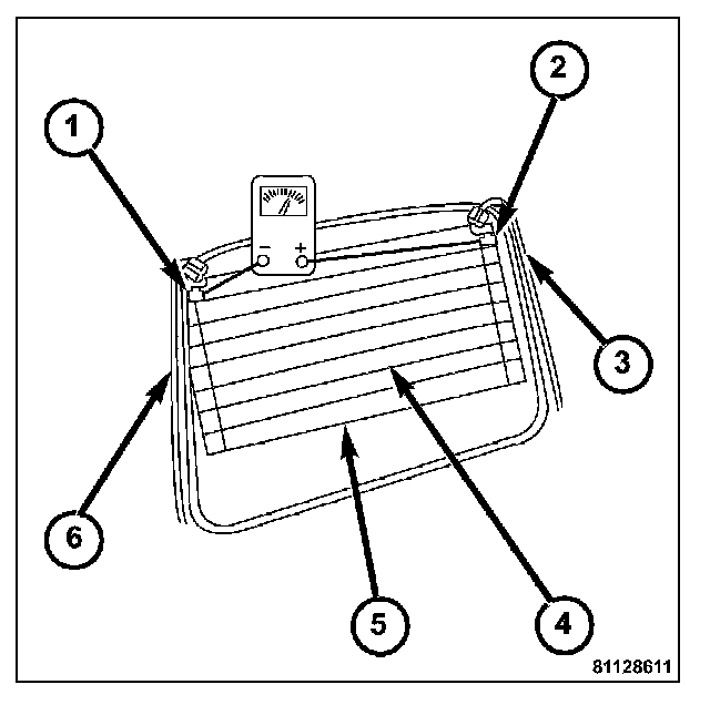 4. Connect the negative lead of the voltmeter to the right side bus bar (2) and touch each grid line (5) at its midpoint (4) with the positive lead. A reading of approximately six volts indicates a line is good. A reading of zero volts indicates a break in the grid line (5) between the midpoint (4) of the grid line and the left side bus bar (1). A reading of ten to fourteen volts indicates a break between the midpoint (4) of the grid line and the right side bus bar (2). Move the positive lead on the grid line (5) towards the break and the voltage reading will change as soon as the break is crossed.