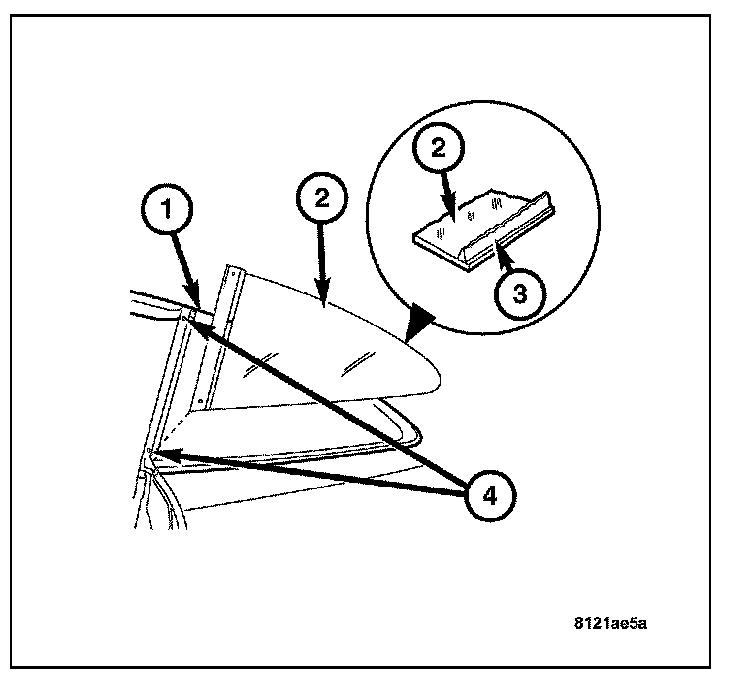 1. Clean inside of glass (2) with Mopar Glass Cleaner and lint-free cloth.